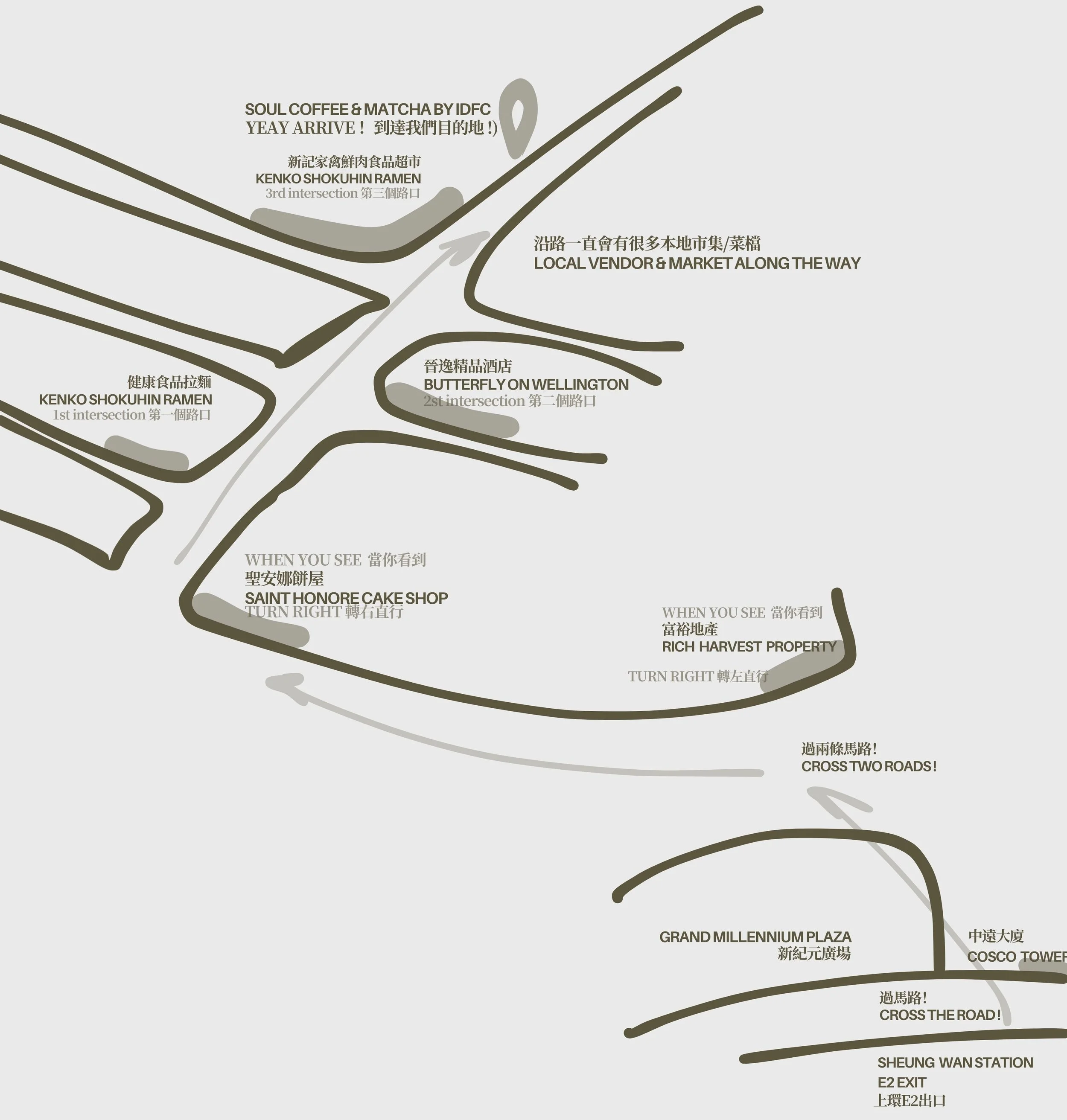 Exit Sheung Wan Station from Exit E2. Cross the road, then go through New Era Plaza. Cross two more roads. When you see Fortune Real Estate, turn left, go straight until you see Saint Honore Cake Shop, then turn right. Keep going straight, pass three intersections, and then go a little further – you will reach your destination.