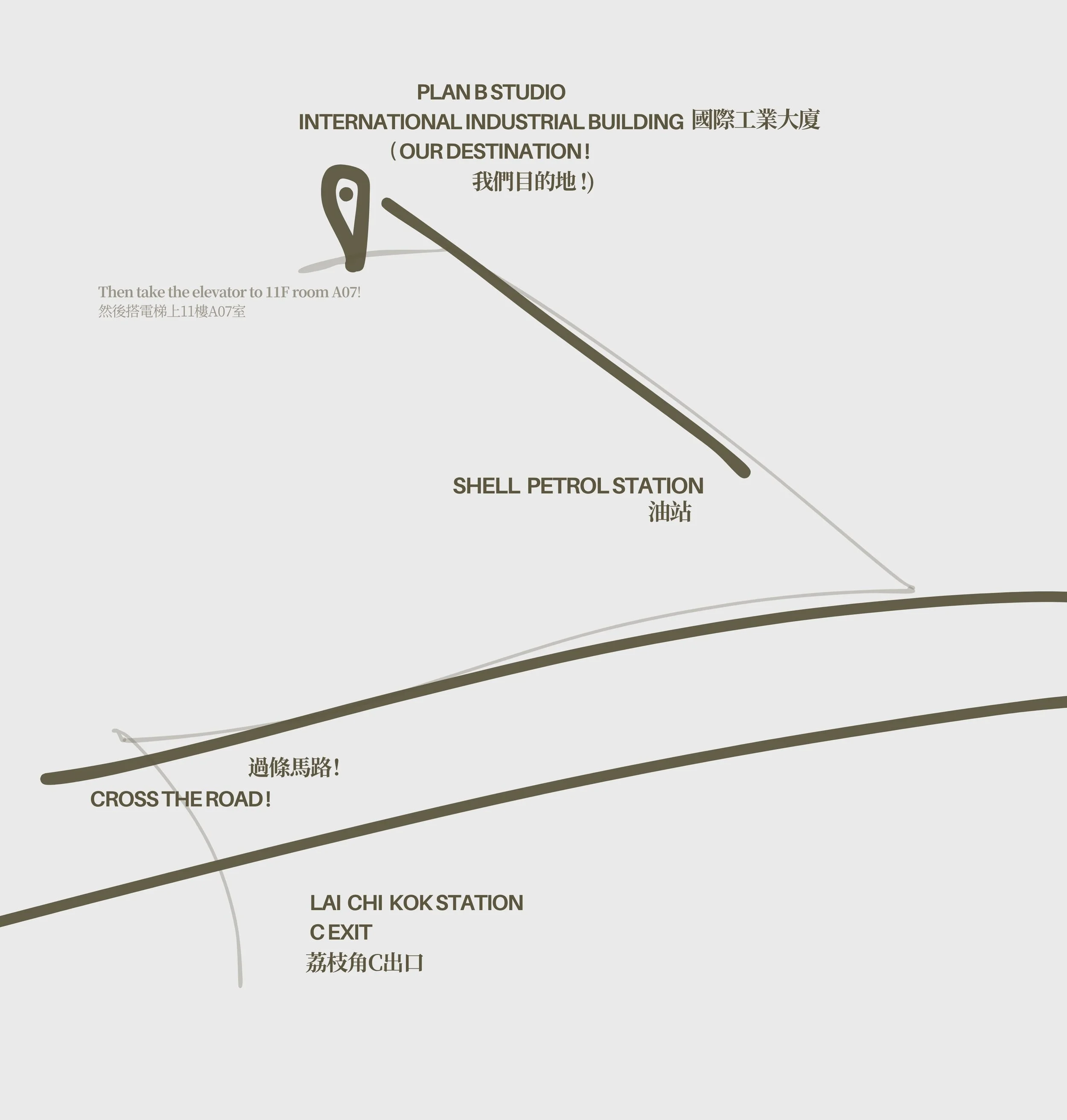 Exit Lai Chi Kok Station from Exit C. Cross the road, then turn right and go straight. When you see a gas station, turn left and continue straight. Then you will arrive at the building! (go straight inside the building, take lift to 11F)